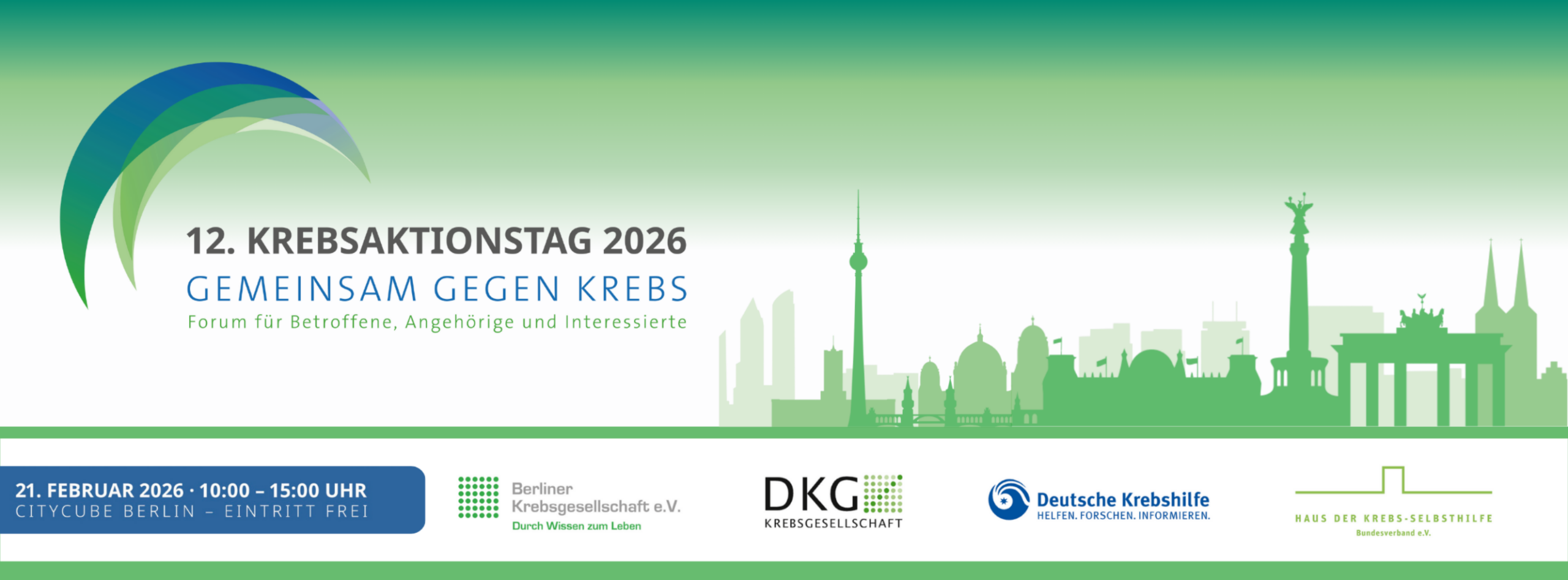 Forum für Betroffene, Angehörige und Interessierte – Am 12. Februar im CityCube Berlin erwartet euch ein vielfältiges Programm aus Vorträgen, kleinen Mitmachaktionen und Infoständen von Selbsthilfegruppen und anderen Organisationen. Ihr könnt euch vor Ort informieren und ins Gespräch kommen. Auch ein Team der Berliner Krebsgesellschaft e. V. ist für euch vor Ort. Der Eintritt und das gesamte Programm sind kostenfrei. Kommt vorbei, wir freuen uns auf euch!
